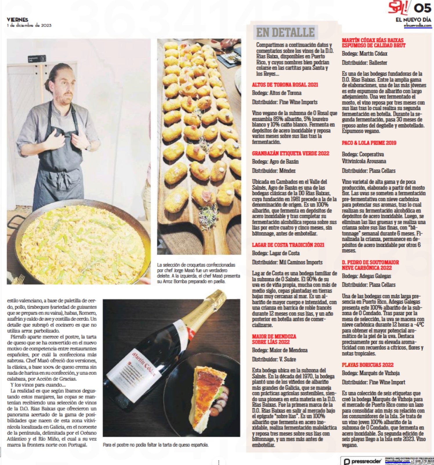 Chef Masó, specialized in Spanish gastronomy, with an emphasis on rice and spoon dishes, has forged his culinary path with unwavering passion. Graduated from the San Juan Hotel School in 2016, he honed his skills at iconic restaurants such as Castellanos and Augusto's, where he worked with renowned chef Ariel. After Hurricane Maria in 2017, he returned to his native Madrid, where his desire to bring an authentic culinary experience to Puerto Rico was strengthened. After collaborating with renowned restaurants in Madrid, such as Raimunda and La Retirada, for executive chef Sergio Fernández; He returned to Puerto Rico in 2019 to run the kitchen at The Sand and The Sea in Cayey. The pandemic led him to found his own company, Masó Chardon, LLC, in 2021, with his wife Mia Chardon. It now offers catering services, private chef, boat chef, product sales and culinary consulting. Discover more about the exciting story of Chef Masó.